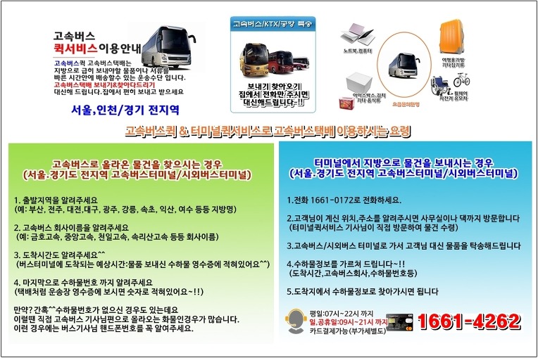 | 특징 | 고속버스나 KTX를 이용하여, 수도권과 지방을 연결하는 가장 저렴하고 빠른 당일 특급배송 서비스 |